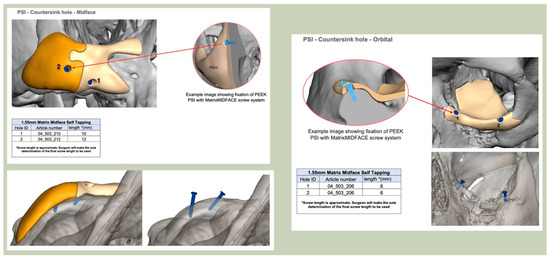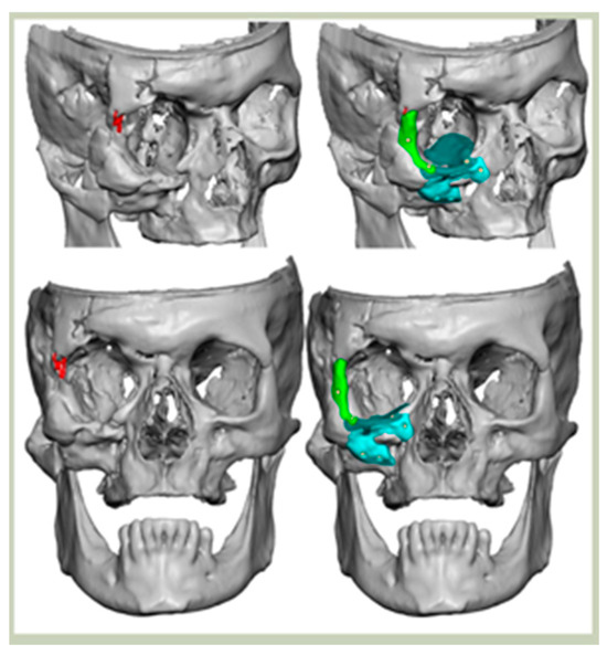- Scolozzi, P.; Martinez, A.; Jaques, B. Complex orbito-fronto-temporal reconstruction using computer-designed Peek Implant. J. Craniofacial Surg. 2007, 18, 224–228. [Google Scholar] [CrossRef]
