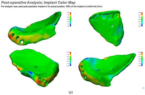 If required and a post-surgical CT scan is available a post-surgical planning report can be undertaken. This is of particular use in the reconstruction of orbital injuries where the correction of globe dystopia and orbital volume can be analysed. It is also possible to assess how close the achieved implant position was to the planned implant position [Figure 12—Post planning reports looking at (a) orbital volume, (b) globe position correction, and (c) the ability to check if the achieved implant position matched the planned implant position].