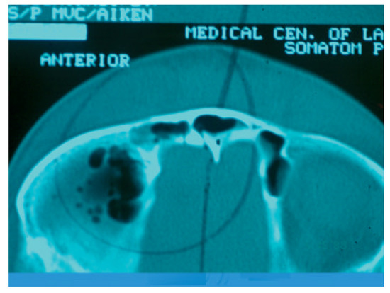 The incidence of intracranial complications is fortunately lower than that of skull-base problems. However, the severity of intracranial pathology seems to be greater and more devastating. These complications include intraparenchymal hemorrhage, brain abscess, pneumocephalus (Figure 7), tension pneumocephalus, expanding pneumocephalus, intracerebral pneumatocele, meningitis, encephalitis, cerebral contusion, increased intracranial pressure (ICP), and chronic headache [31,32,33].