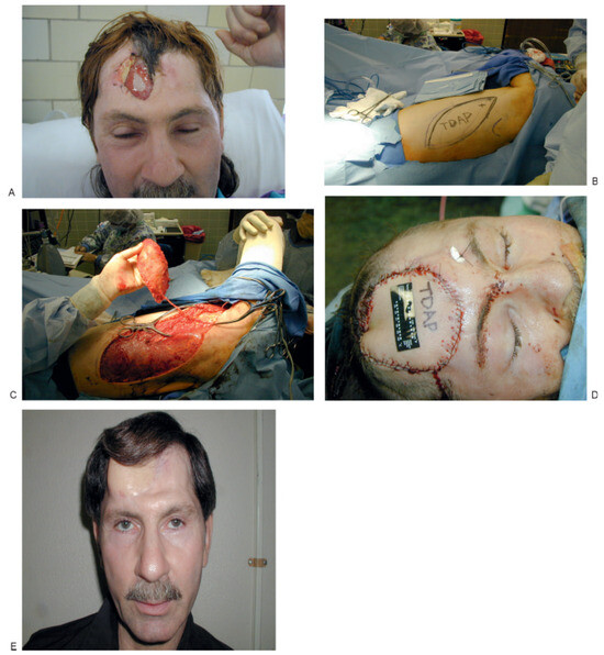 (A) Full-thickness injury through anterior and posterior tables of frontal sinus with loss of skin–soft tissue envelope and devitalized dura in the middle of the wound. (B) Outline for thoracodorsal artery perforator flap (T-DAP) for wound coverage. (C) Excellent pedicle length of T-DAP to reach neck if temporal vessels are not adequate. (D) Inset of T-DAP with closure of defect (vascularized fat used to obliterate remaining sinus). (E) Final result at 1-year postoperative visit.