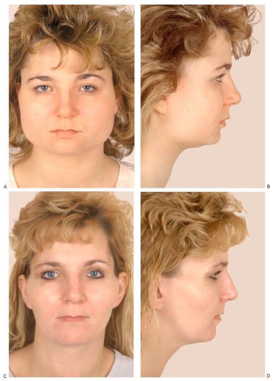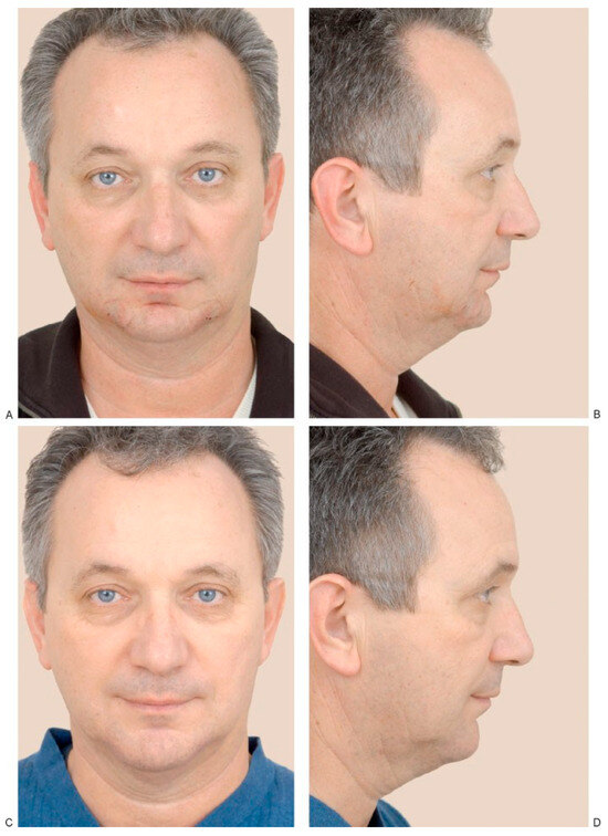 (A,B) A 55-year-old man who presented with a decrease in his lower vertical facial height due to vertical microgenia. Postoperative (C) frontal and (D) profile views following vertical lengthening genioplasty and interposition implant of tricalcium phosphate. (Reprinted with permission from Zins JE. Aesthetic surgery of the aging face and neck. In: Siemionow M, Eisenmann-Klein M, eds. Plastic and Reconstructive Surgery Series. Berlin: Springer; 2009:Figure 26.4).