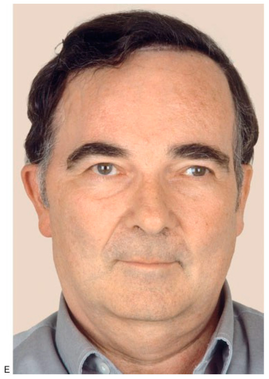(A,B) Masseteric hypertrophy and vertical microgenia. Correction was performed by gonial angle resection bilaterally and vertical lengthening genioplasty using block hydroxyapatite. Front and profile views after surgery. (C,D) Frontal and profile views 8 years later. (E) Intraoperative view of vertical lengthening genioplasty using block hydroxyapatite. (Reprinted with permission from Zins JE, et al. Contour alteration of the facial skeleton. In: Achauer BM, Guyuron B, eds. Plastic Surgery: Indications, Operatons, Outcomes. Philadelphia: Elsevier; 2000:2824. Copyright Elsevier 2000.).