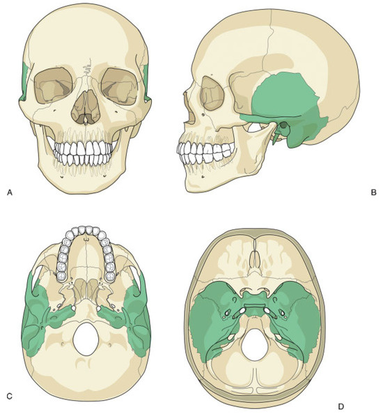 Diagram of the paired temporal bones (shaded) in relation to the human skull. Anterior view (A), right lateral view (B), inferior view (C), and interior view of the skull base (D).