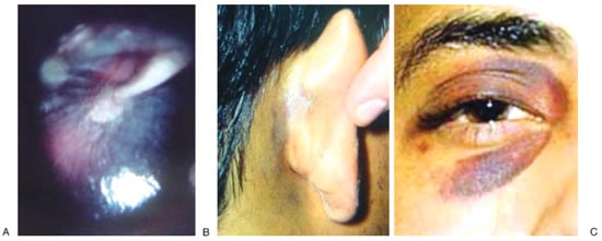 A presumptive diagnosis of temporal bone fracture can be made with the presence of three physical findings. Hemotympanum (A) is a collection of blood in the middle ear and gives the tympanic membrane and reddish-blue hue when visualized externally. Postauricular ecchymosis, or Battle’s sign (B), is an arch-shaped bruise behind the external ear. Periorbital ecchymosis, or Raccoon sign (C), is circular bruising around the eye.