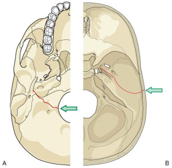 Diagram of common fracture patterns of the temporal bone. Transverse fractures (A) result most often from a blow to the back of the head. The fracture extends from the jugular foramen through the petrous pyramid to the foramen spinosum and foramen lacerum. Longitudinal fractures (B) result most often from a blow to the side of the head. The fracture extends from the squamous portion of the temporal bone to the carotid and jugular foramina.