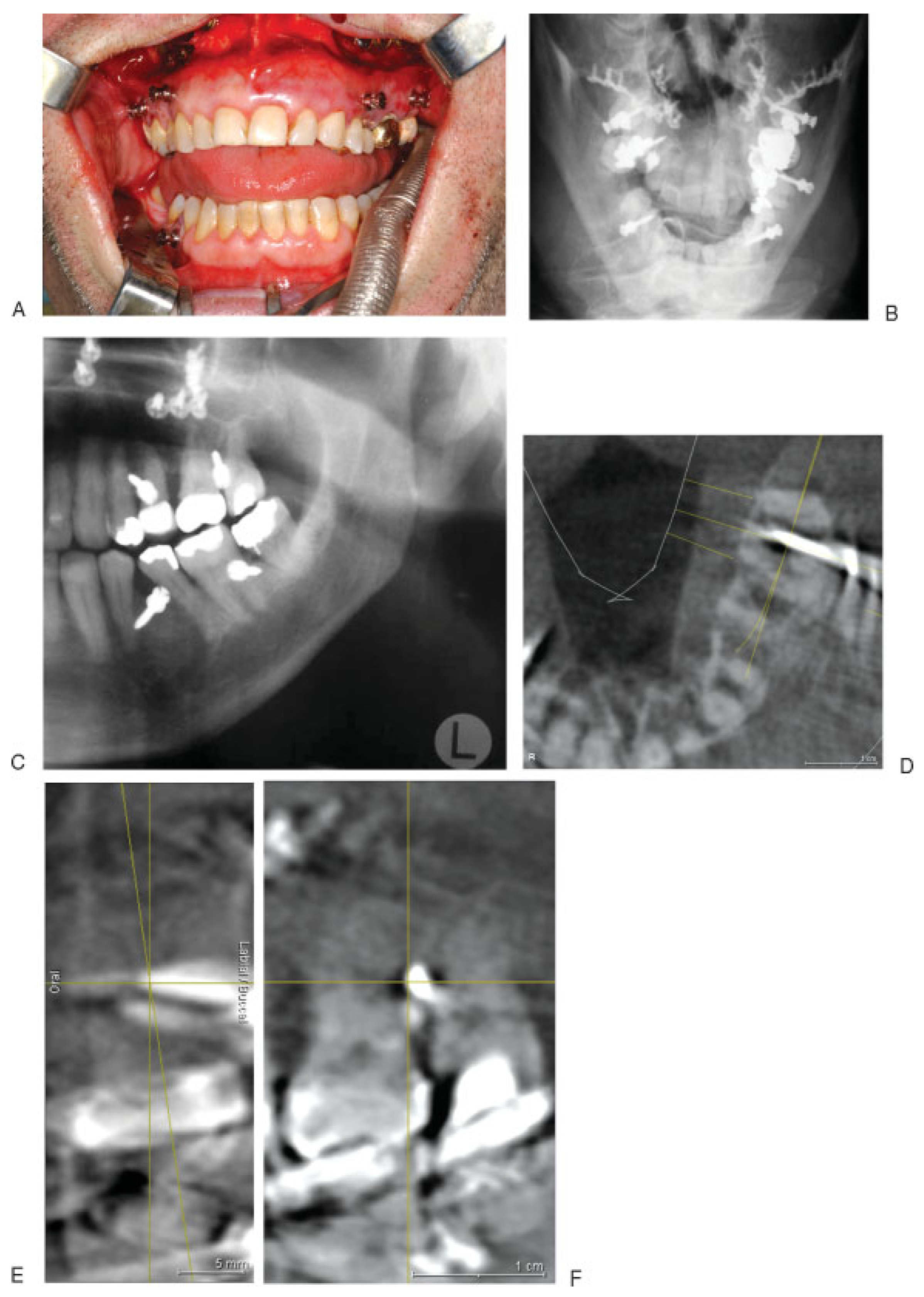 As a matter of principle, the intrabony structures at potential risk for lesions through a screw insertion are reexamined based on the radiographic findings at the onset of the procedure. Panoramic x-rays, axial CT scans, or volume rendered DVTs (digital volume tomography scans/cone beam) are a guideline in bypassing the tooth roots, the maxillary antrum, the mandibular canal, or the mental foramen with preciseness.