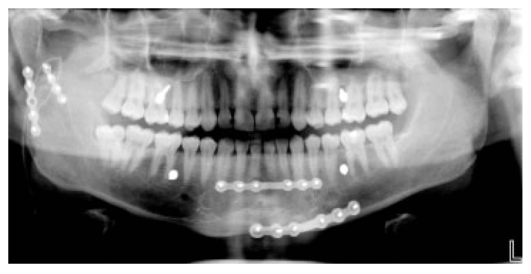 A bilateral block and an additional cross wise (“X”) cerclage pattern based on a total of four MMF screws located on the frontside of the jawbones (