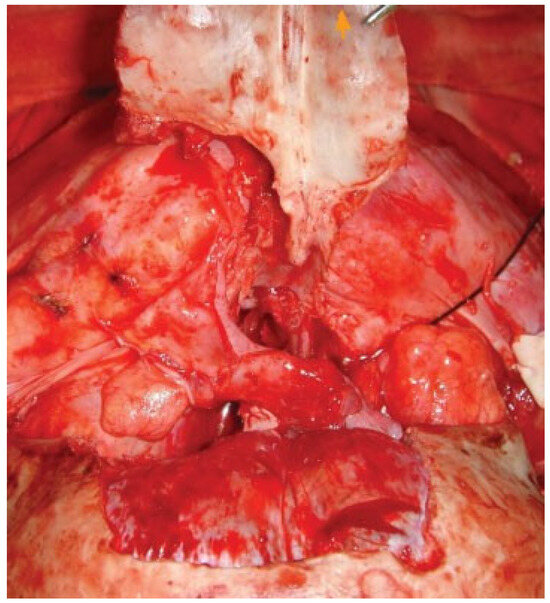 - Goyal, P.; Kellman, R.M.; Tatum, S.A., III. Transglabellar subcranial approach for the management of nasal masses with intracranial extension in pediatric patients. Arch. Facial Plast. Surg. 2007, 9, 314–317. [Google Scholar] [CrossRef]
