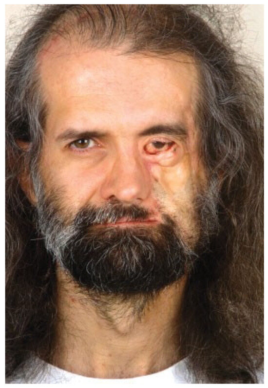 Over the next several months, the patient underwent several procedures attempting to correct his ectropion and the cheek soft tissue deficiency. These included the insertion of three tissue expanders and subsequent advancement of adjacent tissues together with excision of a significant portion of the scarred lower eyelid and cheek. Other attempts at reconstruction of the lower eyelid included a medial canthoplasty, lateral canthoplasty, transposition flap from the upper eyelid, transposition flap from the side of the nose and cheek, and a postauricular skin graft. However, these multiple reconstructive procedures failed to correct the significant scarring and deformity in the cheek and lower eyelid. He subsequently had a left dacryocystorhinostomy that improved his nasolacrimal duct obstruction. Finally, a cranioplasty with calcium phosphate bone cement was performed for contour defect of the left frontoparietal area.