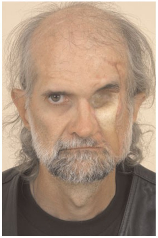The patient underwent several revisions thereafter including thinning and liposuction of the anterolateral thigh flap, excision of part of the skin island of the flap, Z-plasty for repositioning of the left eyebrow of the flap, and full-thickness skin graft from the right groin to the upper orbital area. The patient was fitted with a prosthetic eye 8 months after the flap was performed (Figure 7 and Figure 8). More than 3 years after his last surgery, the patient is satisfied with his appearance and is tolerating the prosthesis well. No further surgeries are currently planned.