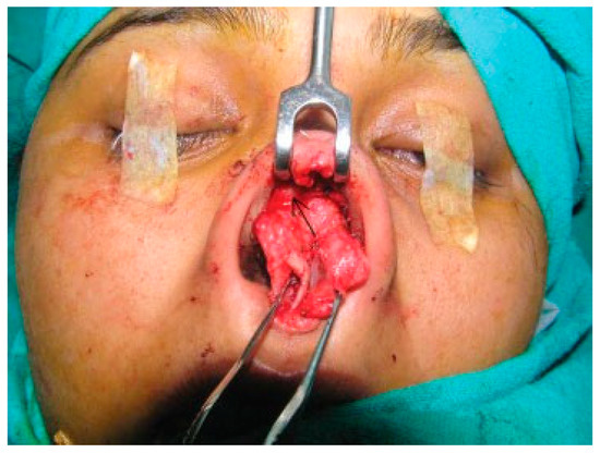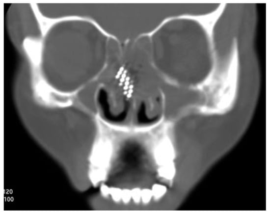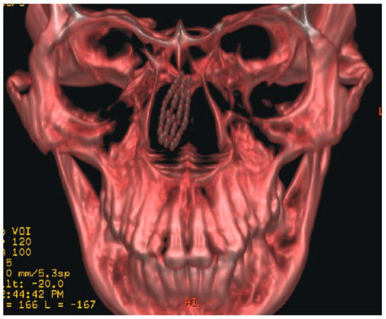 - Ryu, C.H.; Jang, Y.J.; Kim, J.S.; Song, H.M. Removal of a metallic foreign body embedded in the external nose via open rhinoplasty approach. Int J Oral Maxillofac Surg 2008, 37, 1148–1152. [Google Scholar] [CrossRef] [PubMed]
