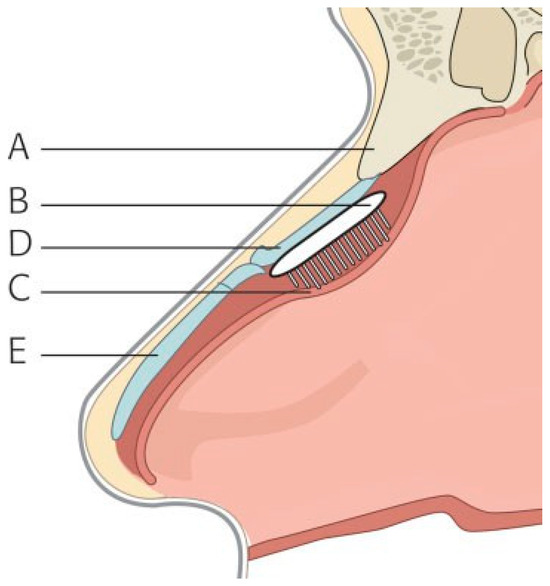 Submucosal position of the foreign body in sagittal section. A, nasal bones; B, foreign body; C, nasal mucosa; D, upper lateral cartilage; E, lower lateral cartilage.