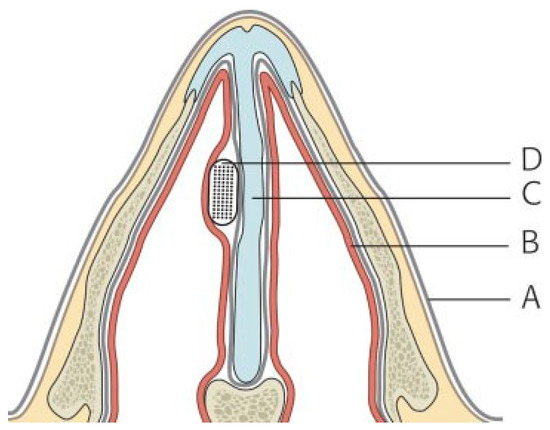 Submucosal position of the foreign body in axial section. A, skin; B, nasal mucosa; C, nasal septum; D, foreign body.