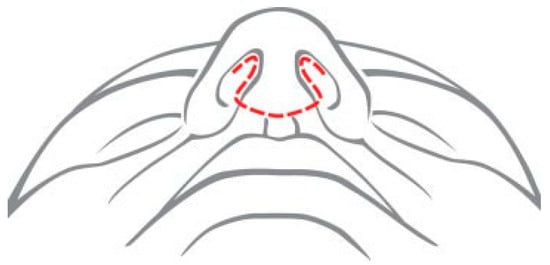 Toothbrush head located between the right-upper lateral cartilage and the nasal septum.