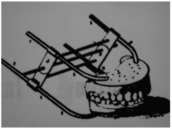 Figure 2. An illustration of the articulator developed and utilized by Bean. [17]. - The ‘‘fragments of the model representing the broken jaw were trimmed, placed in their proper antagonism, and held in position with wax’’ (Figure 3).
