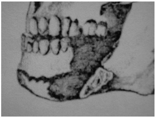 Figure 3. An illustration of fragments of the mandible after gunshot, prealigned with wax. (Image taken from Covey. [17]). - ‘‘The articulator model was then imbedded in plaster and packed with rubber gum.’’