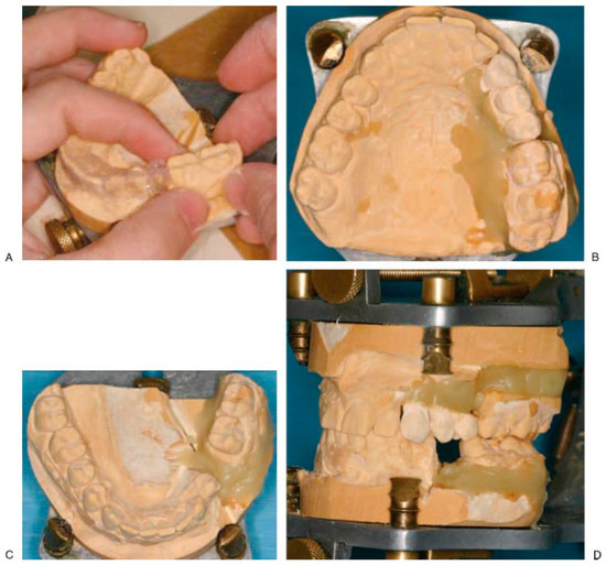 (A–D) Photographs of current, sectioned plaster casts held in place with wax, before and after being placed in an articulator. (Provided by Larry Cunningham, D.D.S.).
