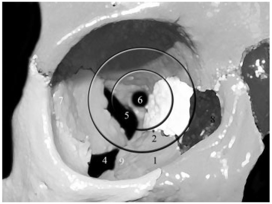 Right orbital sketch: (1) anterior third orbital floor (zone 1); (2) middle-third orbital floor (zone 2); (3) posterior-third orbital floor (zone 3); (4) infraorbital fissure; (5) supraorbital fissure; (6) optical nerve; (7) lateral wall; (8) nasal-lachrymal duct; (9) medial border of the infraorbital fissure.