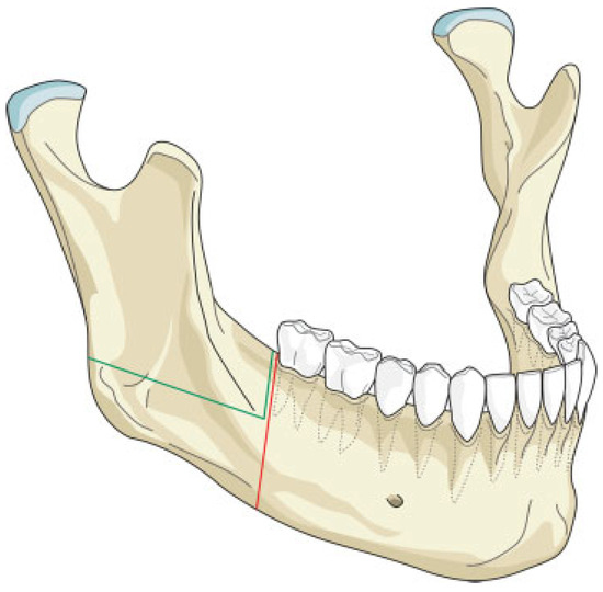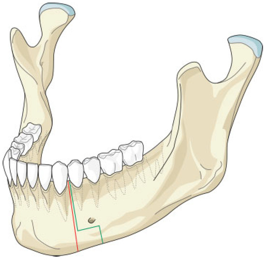 Illustration of the horizontal osteotomy cuts (green lines). The red lines represent the conventional osteotomy cuts without the modification.