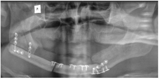 An orthopantomogram showing the fibula flap in place with the horizontal and stepped osteotomy technique.