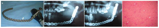 (a) Prebent reconstruction plate. (b) One-week postoperative orthopantomograph. (c) Eighteenth-month postoperative orthopantomograph showing evidence of osteogenesis (arrows). (d) Micrograph showing multinucleated giant cells (arrows).