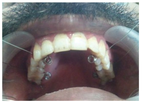 The final positioning of spiral wires in maxilla. Spiral wires are placed in mandible and then the free end of both (maxillary and mandibular) wires are tightened to achieve IMF.