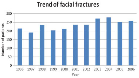 Other studies have found a decrease in the number of fractures over consecutive time periods. This is believed to be due to the significant decrease in road traffic accidents (RTA) over recent times, according to one U.S. study between 1983 and 1987 [13] and a New Zealand study between 1979 and 1998 [6]. This is supported by other studies that found that severe maxillofacial trauma, which often occurs as a result of RTA, decreased significantly over last three decades [14,15].