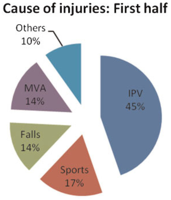 Causes of injuries: first half. IPV, interpersonal violence; MVA, motor vehicle accident.