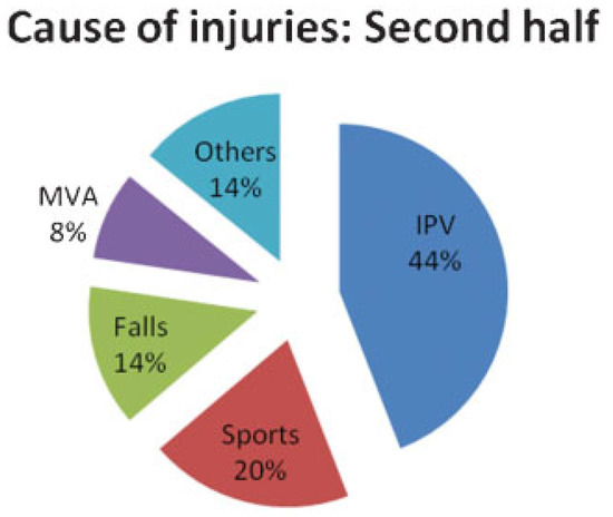 Causes of injuries: second half. IPV, interpersonal violence; MVA, motor vehicle accident.