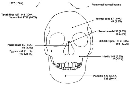 - van Beek, G.J.; Merkx, C.A. Changes in the pattern of fractures of the maxillofacial skeleton. Int J Oral Maxillofac Surg 1999, 28, 424–428. [Google Scholar] [CrossRef]