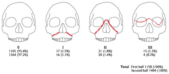 - Afzelius, L.E.; Rosén, C. Facial fractures. A review of 368 cases. Int J Oral Surg 1980, 9, 25–32. [Google Scholar] [CrossRef]