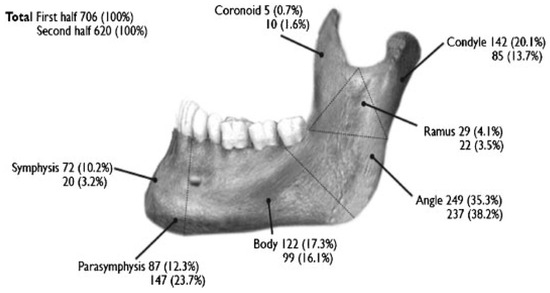 In the mandible, the angle was the most commonly involved site (35.3% and 38.2%; Figure 6). The mandibular fracture sites with the greatest change over the time periods were the symphysis (decreased from 10.2 to 3.2%) and the parasymphyseal region (increased from 12.3 to 23.7%).