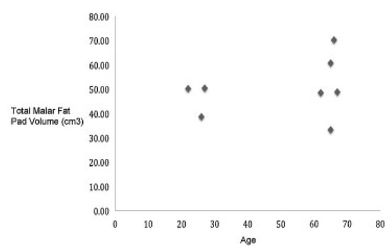 Objective To evaluate how malar fat pad (MFP) volumes vary with age, after controlling for gender and body mass index (BMI). Study Design A prospective case–control study evaluating volume of the MFP in women of two age groups. Methods Soft tissue dimensions were measured in eight subjects using magnetic resonance imaging. A multiplanar localizing sequence, followed in sagittal and coronal orientations using a turbo spin echo sequence, was performed to define the MFP. Volumetric calculations were then performed using a 3D image analysis application (Dextroscope, Volume Interactions, Republic of Singapore) to circumscribe areas, orient dimensions, and calculate volumes of the MFP. Results These data reveal no significant difference in the mean (standard deviation) right MFP (p = 0.50), left MFP (p = 0.41), or total MFP (p = 0.45) volumes when comparing the two age groups. In addition, these data indicate that there was no correlation between age and total MFP volume (Pearson correlation coefficient 0.27). Moreover, there was no correlation between age and the ratio of total volume/BMI (Pearson correlation coefficient −0.18). Conclusions Although the sample size of this study was small, these data indicate that ptosis of midfacial fat is more important than volume loss in midfacial aging. These data would suggest repositioning as the primary modality for craniofacial reconstruction.