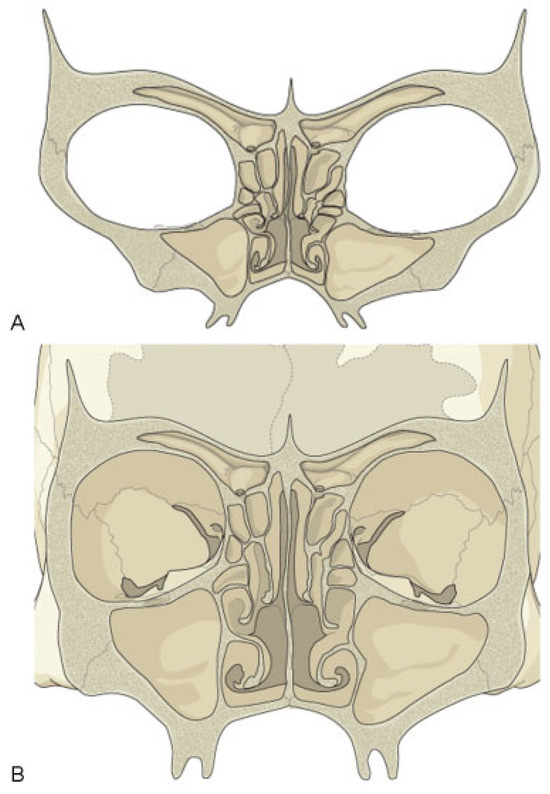 Coronal sections of the pediatric and adult orbit. (A) The thick pediatric orbital floor is contrasted with its diminutive orbital roof. (B) The delicate nature of the adult orbital floor and medial wall is apparent.