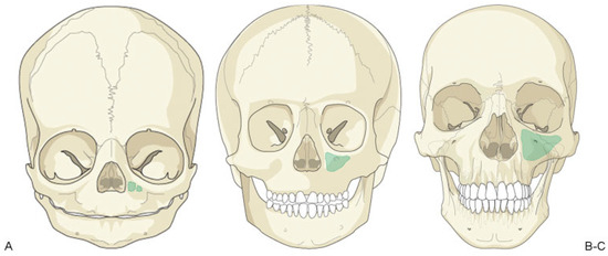 Maxillary sinus development. The progressive increase in size of the maxillary sinus (green) is seen (A) at birth, (B) at 5 years of age, and (C) in the adult.