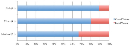 In developed countries, trauma is the leading cause of death among children. A review of the National Trauma Databank, 2001 to 2005, identified 12,739 facial fractures among 277,008 pediatric trauma patient admissions (4.6%) [7]. The relative paucity of facial fractures in children—when compared with adults—has been previously demonstrated [8,9]. The preponderance of elastic, cancellous bone and the aforementioned high cranium-to-face ratio in children (Figure 3) are responsible for this finding. As a corollary, children are more likely to sustain skull fractures and brain injuries than facial fractures [10,11,12]. Indeed, facial fractures are rare before the age of 5 [13]. Rowe, for example, reported that only 1% of all facial fractures occur in children 1 year old or younger [14]. These results were echoed by other series [1,9,15], although the incidence may be underestimated, as these studies predate the use of routine computed tomography (CT) scans in craniofacial trauma [16].