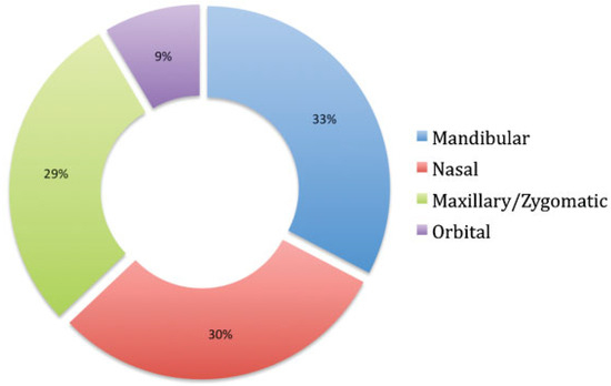 The relative frequency of pediatric facial fractures according to anatomical location is seen in Figure 5 [7]. In most series of pediatric facial trauma, orbital fractures comprise 5 to 25% of facial fractures [17]. In the National Trauma Databank review, orbital fractures were identified in 10% of cases. Variability in facial fracture patterns has also been shown between urban and rural environments [18]. As in adults, boys are twice as likely to sustain facial fractures than girls. A seasonal variation in pediatric facial fractures should also be noted. Logically, the peak month in the United States is July, corresponding to increased patterns of outdoor play.