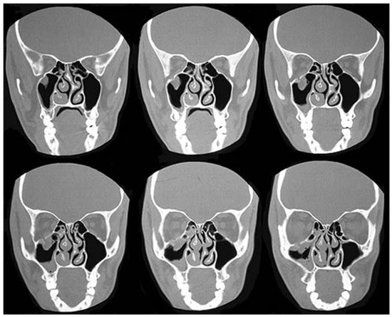In utero, the sinuses and nasal cavity are a single structure. The ethmoid, frontal, and maxillary sinuses then subdivide from the nasal cavity in the second trimester. Subsequent sinus formation occurs in a predictable sequence. The maxillary sinuses are the first to develop. The growth of these paired sinuses is biphasic, occurring between 0 to 3 and 7 to 12 years of age. During mixed dentition, the cuspid teeth are immediately beneath the orbit: hence the term eye tooth in dental parlance. It is not until age 12 that the maxillary sinus expands, in concert with eruption of the permanent dentition. At 16 years of age, the maxillary sinus reaches adult size (Figure 2) [1]. These changes are a quintessential example of the how ongoing sinus development impacts fracture patterns and susceptibility. Specifically, the presence of the unerupted maxillary dentition serves to resist orbital floor fracture in young children [2].