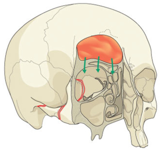 - Messinger, A.; Radkowski, M.A.; Greenwald, M.J.; Pensler, J.M. Orbital roof fractures in the pediatric population. Plast Reconstr Surg 1989, 84, 213–216, discussion 217–218. [Google Scholar] [CrossRef] [PubMed]