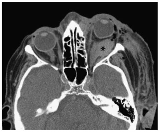 Axial computed tomography view showing typical radiologic signs of a retrobulbar hematoma: globe-shaped bulb, axial proptosis, and retrobulbar fluid accumulation (marked with asterisk).