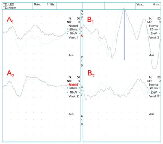 Posttraumatic ERG (A1 right eye, A2 left eye) and VEP (B1 right eye, B2 left eye). Note the physiologic VEP with a clear amplitude (blue bar) for the right eye (B1) and the pathologic VEP with a missing amplitude for the left eye (B2); ERG on both sides without pathologic findings. Abbreviations: ERG, electroretinogram; VEP, visual evoked potential.