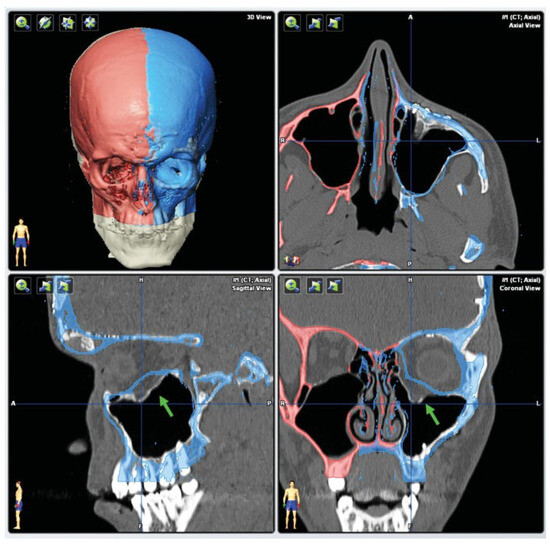 Posttraumatic secondary reconstruction of the left orbit: preoperative planning. The unaffected right side (red) is reflected onto the affected left side (blue), creating a virtual template for reconstruction of the left orbit. The orbital floor fracture is marked with a green arrow. Abbreviation: CT, computed tomography.