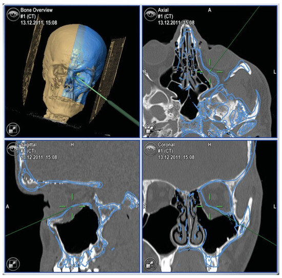 - Kurzeja, A.; Wenzel, M.; Korves, B.; Mösges, R. Decompression of the optic nerve after fractures of the rhino-basal skull with computer- assisted surgery. Laryngorhinootologie 1994, 73, 274–276. [Google Scholar] [CrossRef]