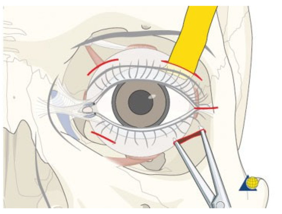 Decompression of the orbital compartment: surgical procedure. Four incisions are placed in natural creases directly above the supra- and infraorbital rim. After dissecting the orbicularis muscle and the orbital septum (palpebral ligament), the four incisions are elongated into the orbit behind the globe securely in contact with bone. Elastic drainage tubes are inserted to release extraconal and intraconal hematomas from the orbit. Illustration reproduced by kind permission of the AO Foundation, Davos, Switzerland.