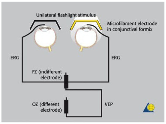 The retina is negatively charged whereas the cornea is posi- tively charged. Therefore, the bulb represents an electrical dipole. The electrical activity of the first and second neurons of the visual pathway is measured by electroretinography; the function of the retinal ganglion cells (third neuron of the visual pathway) is not included in the electroretinogram (ERG) [23]. Variations in the ERG are caused by refracting changes in the eye as well as by pathologic changes in the retina itself. Disorders of the visual system from the refracting media to the visual cortex can be registered by cortical records of visual evoked potentials (VEPs). Thus, functional localization of visual pathway damage between retinal ganglion cells and the visual cortex is possible by combining ERGs and VEPs.