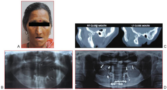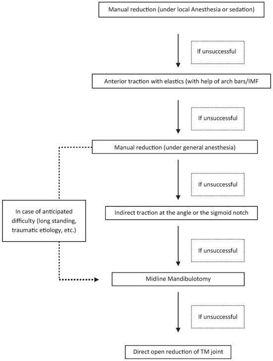 - Lee, S.H.; Son, S.I.; Park, J.H.; Park, I.S.; Nam, J.H. Reduction of prolonged bilateral temporomandibular joint dislocation by midline mandibulotomy. Int J Oral Maxillofac Surg 2006, 35, 1054–1056. [Google Scholar] [CrossRef] [PubMed]