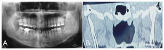 (A) Panoramic radiograph showing neoplasia in left mandibular body and ramus. (B) Axial computed tomography showing idiopathic condylar resorption of the right condyle.