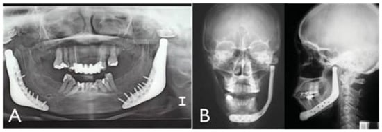 The personalized or custom-made prostheses used for the current study were produced by TMJ Concepts, Inc. (Ventura, CA). These reconstruction devices are designed by computer-aided systems, and the prostheses are manufactured follow-ing a stereolithographic model in all patients, which is produced through the patient’s three-dimensional computed tomography. The fossa component has a part that is made of pure titanium, which is fixed onto the base of the cranium, and an articulating surface, which is made of ultra-high-molecular-weight polyethylene and is bonded to the titanium base. The mandibular component (ramus-condyle) is made of wrought titanium alloy (6A1/4V) and the condylar head is made of an alloy containing chrome (28%), cobalt (64%), and molybdenum (6%) [,]. These prostheses have been used for more than 20 years and have shown satisfactory long-term stability, without any evidence of foreign body reactions or other complications such as fracture or material failure (Figure 1) [,].
