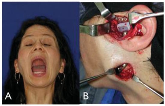 (A) Postoperative mouth opening after making total replacement of temporomandibular joint (TMJ) with custom prosthesis by TMJ Concepts, Inc. (Ventura, CA). (B) Intraoperative mandibular function after placement a custom TMJ prosthesis by TMJ Concepts, Inc.