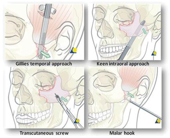 - Czerwinski, M.; Martin, M.; Lee, C. Quantitative comparison of open reduction and internal fixation versus the Gillies method in the treatment of orbitozygomatic complex fractures. Plast Reconstr Surg 2005, 115, 1848–1854, discussion 1855–1857. [Google Scholar] [CrossRef] [PubMed]